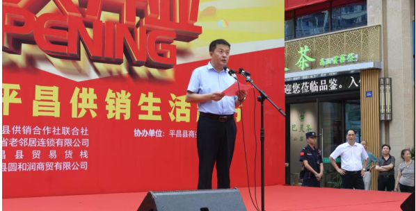 中共平昌縣縣委副書記曹光輝代表平昌縣委、縣政府致辭。他指出,省供銷社及直屬集團(tuán)公司對(duì)平昌縣供銷社給予了高度重視和大力支持,2021以來(lái),向平昌縣支持了綜合改革、農(nóng)業(yè)社會(huì)化服務(wù)、茶葉產(chǎn)業(yè)等6個(gè)項(xiàng)目,投入項(xiàng)目補(bǔ)助資金1311萬(wàn)元,使平昌成為首個(gè)全省供銷系統(tǒng)為農(nóng)服務(wù)綜合平臺(tái)建設(shè)試點(diǎn)縣。他認(rèn)為,“老鄰居•平昌供銷生活超市”的順利開業(yè),標(biāo)志著平昌供銷為農(nóng)服務(wù)綜合平臺(tái)試點(diǎn)縣建設(shè)取得了重要成果,也預(yù)示著“老鄰居”品牌在平昌這片熱土上的新生,這一創(chuàng)新舉措既是強(qiáng)基固本、優(yōu)城興業(yè)的生動(dòng)體現(xiàn),更是開放合作、守正創(chuàng)新的具體實(shí)踐。他強(qiáng)調(diào),“老鄰居•平昌供銷生活超市”連鎖網(wǎng)絡(luò)的問世,給平昌人民提供了大量的就業(yè)崗位,彰顯出“保供、保質(zhì)、穩(wěn)價(jià)”公有制企業(yè)特性,為平昌經(jīng)濟(jì)社會(huì)帶來(lái)了全新的物流業(yè)態(tài)和消費(fèi)時(shí)尚。他表示,要以省市供銷社對(duì)平昌縣的重視和關(guān)懷為契機(jī),以《四川省供銷合作社條例》為準(zhǔn)則,以“兩個(gè)加快”為抓手,主動(dòng)擔(dān)當(dāng)作為,全面推進(jìn)供銷合作社綜合改革,奮力推動(dòng)供銷合作事業(yè)高質(zhì)量發(fā)展。