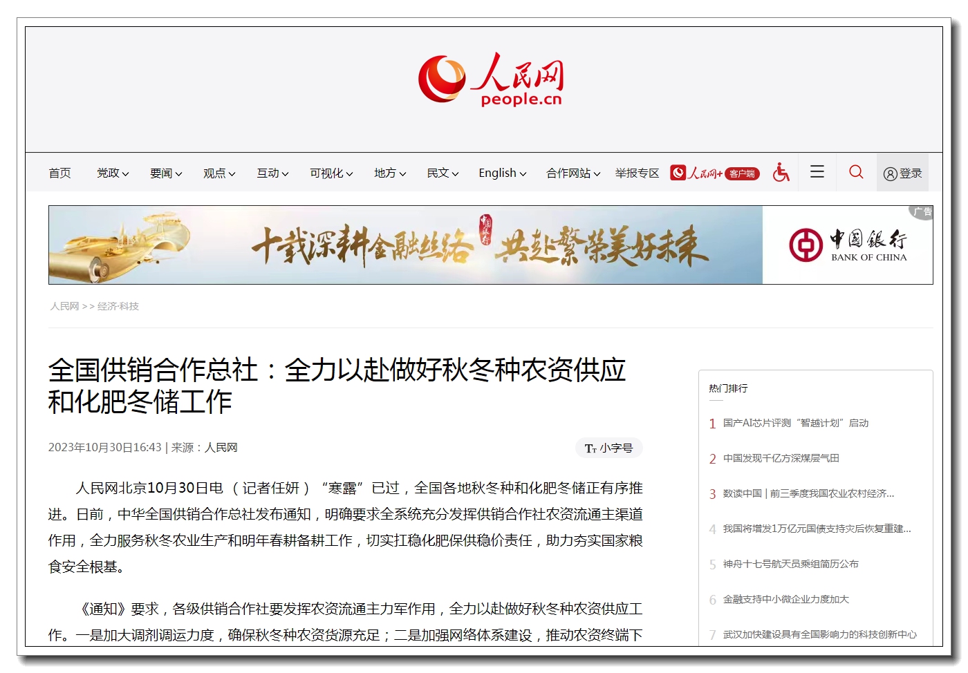 “寒露”已過,全國各地秋冬種和化肥冬儲正有序推進。日前,中華全國供銷合作總社發(fā)布通知,明確要求全系統(tǒng)充分發(fā)揮供銷合作社農資流通主渠道作用,全力服務秋冬農業(yè)生產和明年春耕備耕工作,切實扛穩(wěn)化肥保供穩(wěn)價責任,助力夯實國家糧食安全根基。