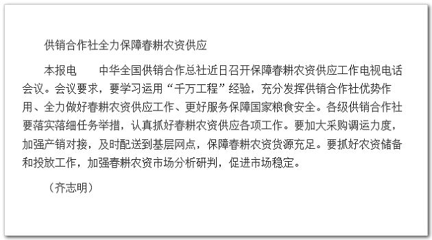 中華全國供銷合作總社近日召開保障春耕農(nóng)資供應(yīng)工作電視電話會(huì)議。會(huì)議要求,要學(xué)習(xí)運(yùn)用“千萬工程”經(jīng)驗(yàn),充分發(fā)揮供銷合作社優(yōu)勢(shì)作用、全力做好春耕農(nóng)資供應(yīng)工作、更好服務(wù)保障國家糧食安全。各級(jí)供銷合作社要落實(shí)落細(xì)任務(wù)舉措,認(rèn)真抓好春耕農(nóng)資供應(yīng)各項(xiàng)工作。要加大采購調(diào)運(yùn)力度,加強(qiáng)產(chǎn)銷對(duì)接,及時(shí)配送到基層網(wǎng)點(diǎn),保障春耕農(nóng)資貨源充足。要抓好農(nóng)資儲(chǔ)備和投放工作,加強(qiáng)春耕農(nóng)資市場(chǎng)分析研判,促進(jìn)市場(chǎng)穩(wěn)定。